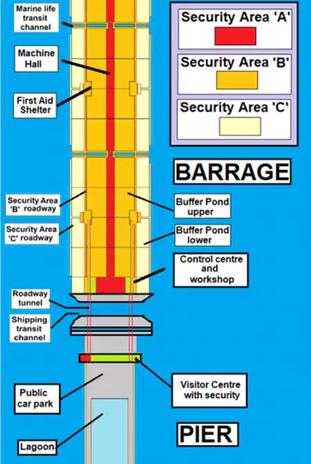 Three security areas A, B and C are shown. Area C is deliberately made accessible to the public from the water. This responds to the needs of persons in distress in the estuary particularly those who have entered the water accidentally (e.g. from a capsized sailing craft or a 'man overboard'). Ladders are fixed at intervals along the side of the barrage to enable those who can to climb out.
