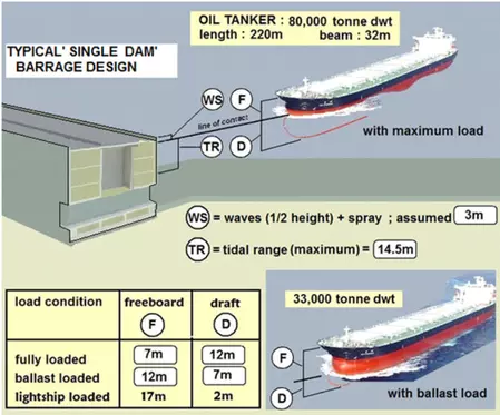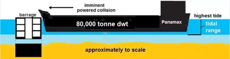 The barrage has to be capable of resisting a collision from any ship in the Bristol Channel both from downstream or from upstream of the structure. A worst-case collision scenario is a ship deliberately driven at speed into the barrage - such as a vessel hijacked as part of a terrorist attack. Designated 'exclusion areas' and other forms of maritime policing are unlikely to prevent this happening. Avonmouth docks plan to accommodate vessels 'up to 150,000 tonne dwt', Cardiff docks currently harbour up to 20,000 tonne dwt. Larger ships ply their trade at ports in South Wales downstream of the barrage. Clearly, the barrage must be of a very robust design and incorporate engineering features that enable it to repel collisions from any such vessels whilst at the same time minimising the loss of hydroelectric power generation.