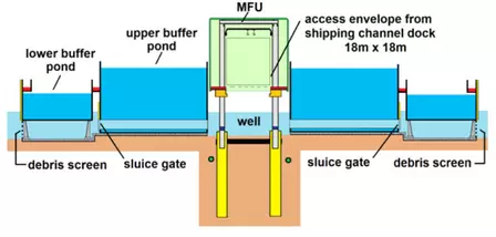 Coarse debris screens are situated on the barrage outer walls. Water passes through them and on underneath the lower buffer pond where, after some 40 metre, it encounters a one metre high step above which it passes through a 60 metre bank of five metre diameter tubes that form part of the upper buffer pond containment. It then reaches the well underneath the MFU.