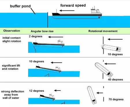 Buffer ponds make use of the buoyancy and the strong non-symmetrical fluid forces that naturally occur when the bow of a ship encounters water at a much higher level. Where the magnitude of the increase in level is comparable to the vessel draft the bow of a ship readily rises and turns about its metacentre.