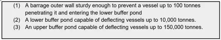 A large ship collision has the potential to produce a catastrophic breakthrough of the barrage and release extremely destructive water flows through the breach. The solution adopted is not to try to absorb forces arising from the forward movement of a ship but to deflect it sideways towards the shoreline (where it will do less damage) using buffer pond technology.