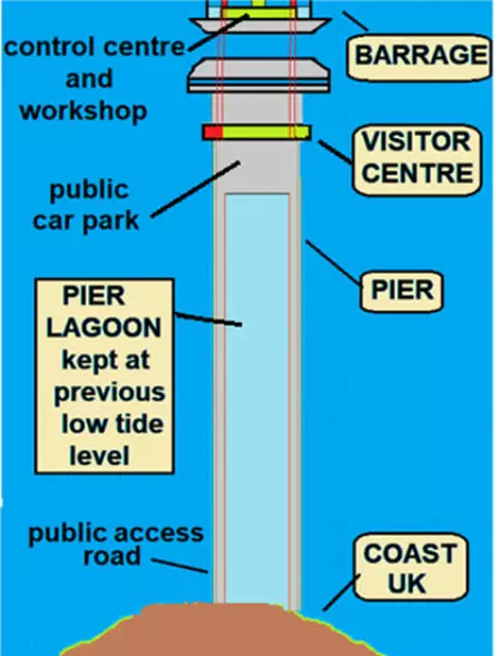 Two piers reach out to the barrage from the UK coast. One is from Aberthaw and one is from Minehead. Each contains a lagoon formed by two containment walls. On top of these walls is a roadway. The road on the upper estuary side provides public access to a Visitor Centre that overlooks a Shipping Channel at the end of the pier.